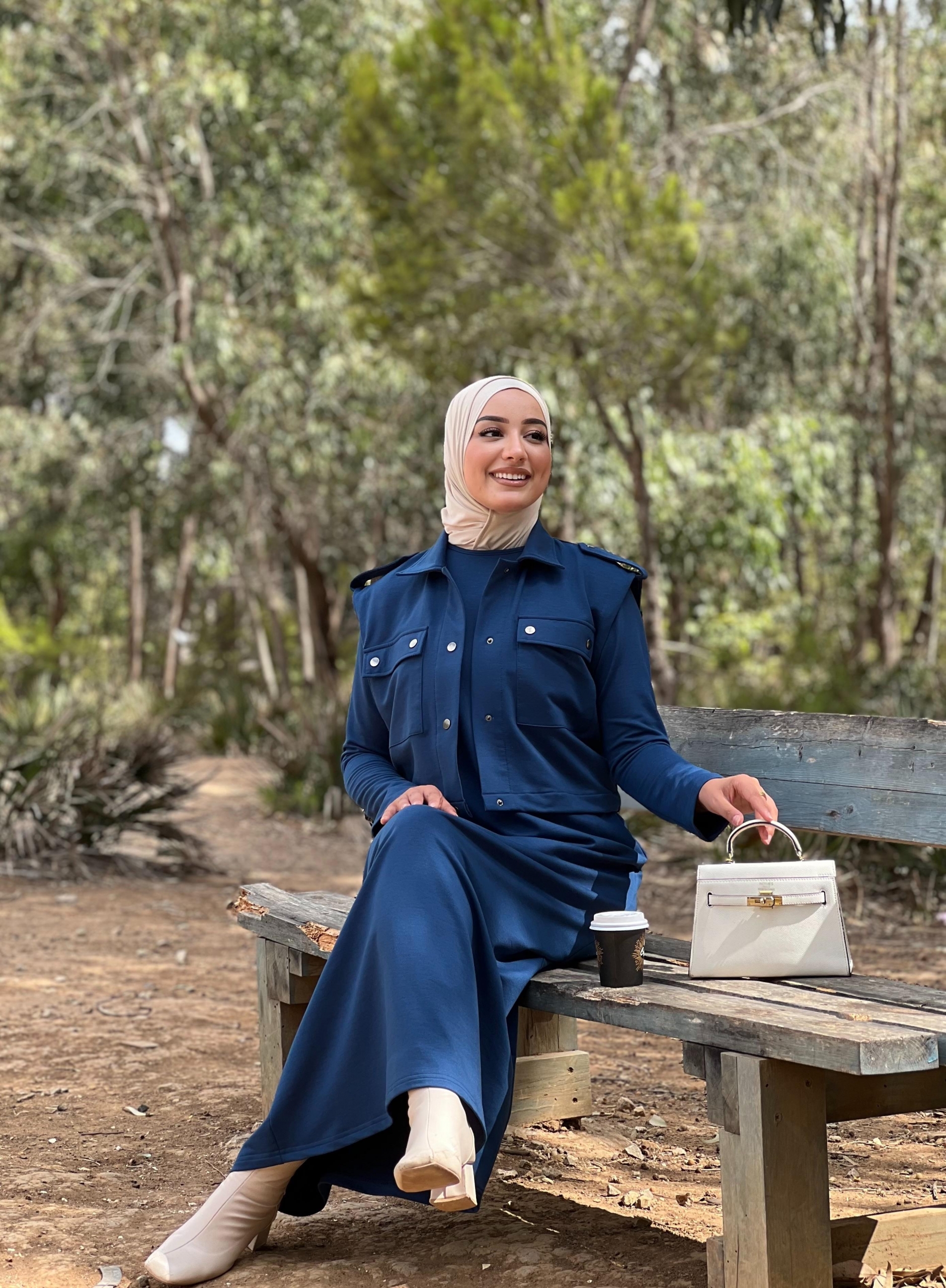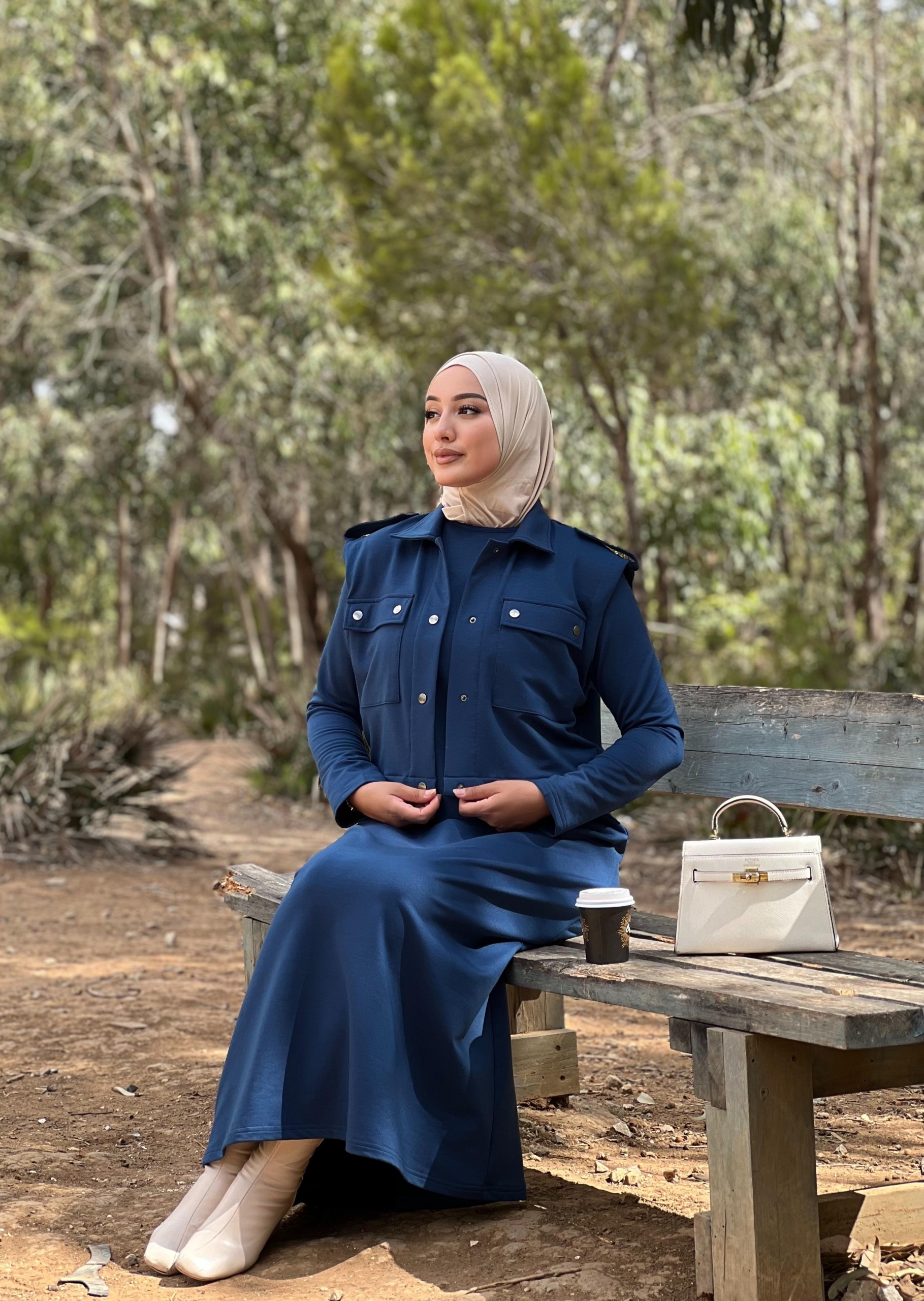Robe élégante avec un gilet , la robe est confortable avec manches classiques , gilet avec poches à rabat sur la poitrine , fermeture sur le devant avec boutons-pressions , cette robe peut se porter avec un style casual et classique .